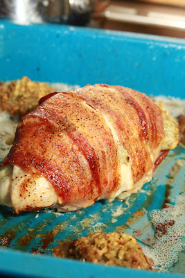 Next up is some streaky bacon. Wrap it around the stuffed breast and fold it under the chicken to hold it in place.